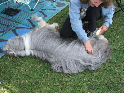 After watching some of the herding instinct tests on friends' dogs, we escaped the heat and headed west to Sonoma County, where we checked into our temporary abode (just for tonight). We checked out the show hotel we'll be at tomorrow and I went to the Beardie Agility Diehards dinner. Walking around the hotel was a riot - I recognized every second or third person I passed from past nationals. After a bit of drama over setup space near the rings - and really, would it even be a dog event without drama? - I left my EZ-Up in a small open space and came back to the hotel room with the dogs. They've eaten, they've humped each other like crazy and now it is time for bed.