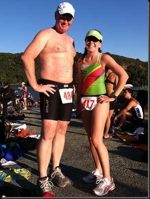 And then it was off to the hard hilly 5k run, with my HR sky-high from the swim.  As I headed down the first long hill and was just passing Jill, a passing car honked loudly and Jill laughed “well someone really likes your outfit.”  I looked over to see it was actually Jeff, coming to see Nigel and me finish.  I told her, “He’s married to me, he has to like it.”